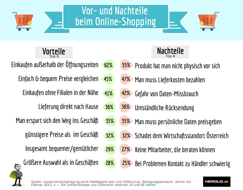 Wo liegen nun die Vor- und Nachteile des Online- und Offline-Shoppings? Für die meisten (61,8 Prozent) bietet der Einkauf im Netz die Möglichkeit, auch außerhalb der Öffnungszeiten zu shoppen. Dahinter folgen Faktoren wie das einfache und bequeme Vergleichen von Angeboten und Preisen (45,2 Prozent) und das Einkaufen bei Anbietern ohne Filiale in der Nähe (40,8 Prozent). Den größten Nachteil betrachten die Online-Shopper bei der nicht vorhandenen Möglichkeit, das Produkt anzugreifen (55,3 Prozent). Dahinter folgen Faktoren wie Lieferkosten (47 Prozent) und die Gefahr von Daten-Missbrauch (41,5 Prozent). „Vor- und Nachteile des Offline-Shoppings lesen sich wie das Spiegelbild zu jenen des Online-Shoppings“, wie Schwabl betont. So wird als größter Vorteil mit 71,7 Prozent erachtet, das Produkt direkt vor sich zu haben. Als größter Nachteil werden die beschränkten Öffnungszeiten gesehen (56,8 Prozent).