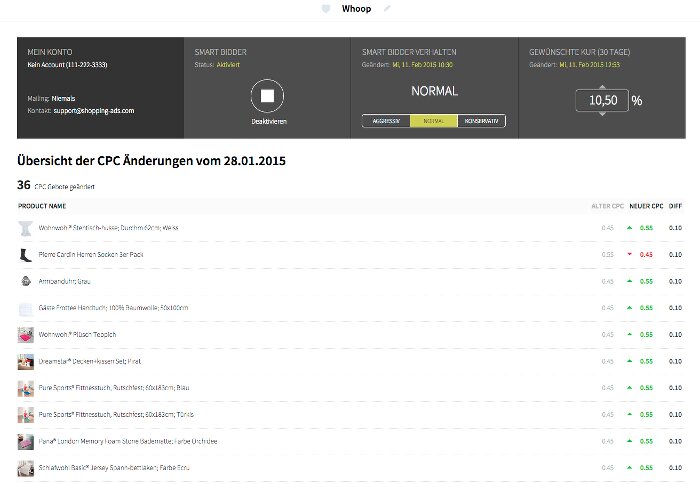 Steigende Werbekosten verlangen effiziente, produktgenaue Optimierung – diese lässt sich aber besonders bei großen Produktsortimenten manuell nicht mehr zeitnah und effizient durchführen. Whoop! (www.shopping-ads.com) ist eine Bid Management Innovation von smec – Smarter Ecommerce und speziell für Google Shopping Ads entwickelt. Der neue Algorithmus identifiziert ohne Vorlaufzeit automatisch das Umsatzpotential jedes einzelnen Produktes und setzt unmittelbar individuelle CPCs fest. Onlinehändler können so Werbekosten effizient senken, sowie Zeit und Ressourcen einsparen.