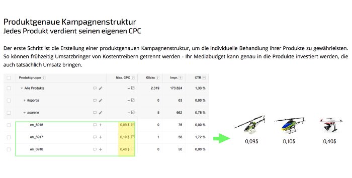 Produktgenaue Werbung über Shopping Ads verspricht höhere Umsätze, weil potenzielle Kunden, die schon sehr nahe am Kaufabschluss stehen, Produkte sehr exakt suchen. Ein großer Teil dieses Umsatzpotentials, oftmals mehr als 80 Prozent, verteilt sich dabei auf einzelne Produkte, die jedes für sich wenig gesucht und oft nur ein oder zweimal gekauft werden (Longtail). Diese enorme Reichweite kann aber auch hohe Kosten verursachen, wenn die Klickgebote für die Produktanzeigen nicht optimiert werden, da nicht jedes der beworbenen Produkte auch tatsächlich Umsätze bringt. Wesentlich ist es also, möglichst früh die Umsatzbringer von den Kostentreibern zu unterscheiden. Die Optimierung des Bid Management ist für die Effizienz der eingesetzten Budgets der wichtigste Hebel.